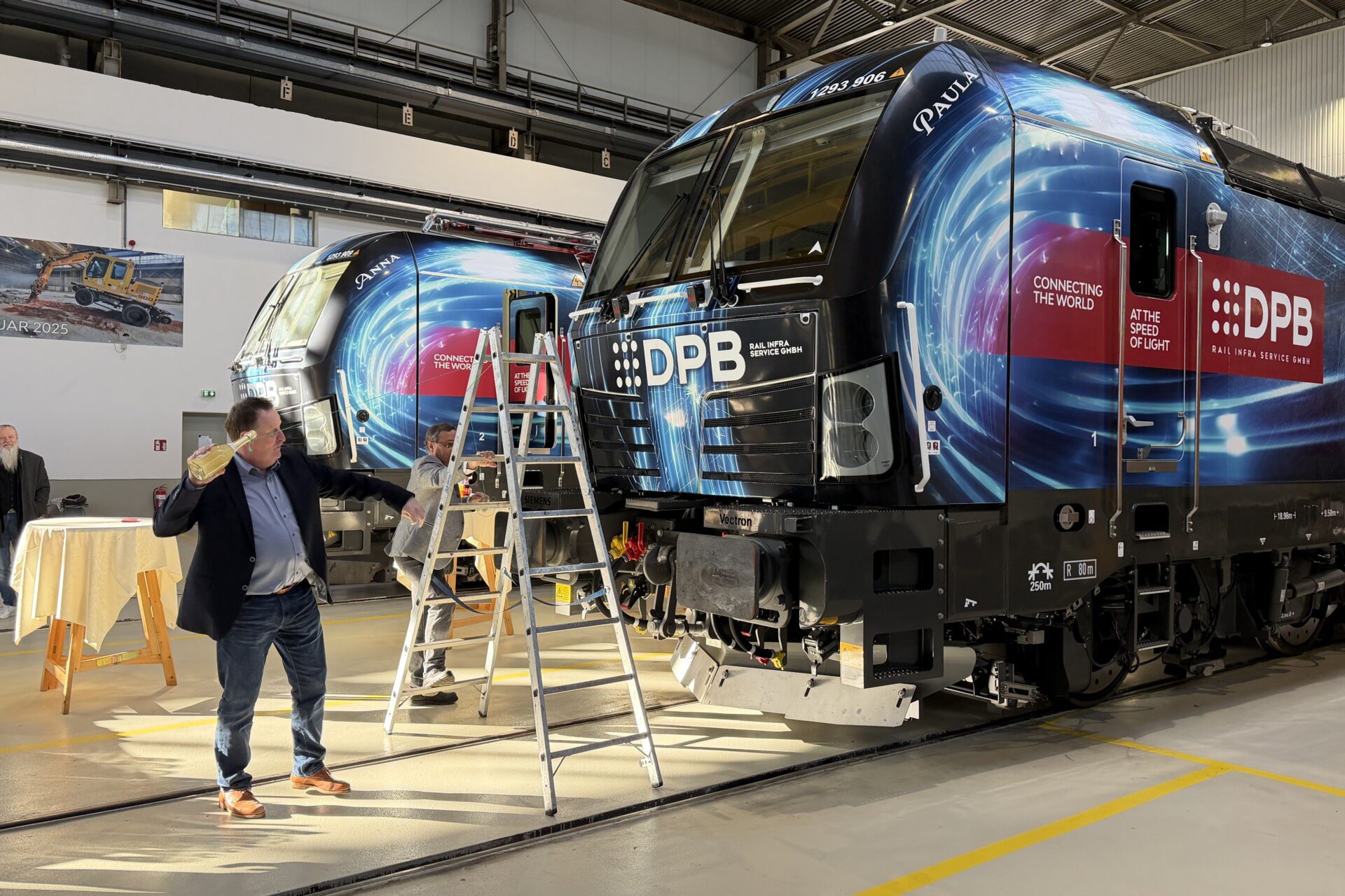 Als Zeichen der partnerschaftlichen Zusammenarbeit nahmen Wilhelm Moser, geschäftsführender Gesellschafter der DPB Rail Infra Service GmbH, und Tanja Kienegger, Geschäftsführerin der Siemens Mobility Austria GmbH, die Sekt-Taufe vor. Die beiden Lokomotiven tragen die Namen „Anna“ und „Paula“, und setzen damit die Tradition der Namensgebung fort – benannt nach den Großmüttern von Wilhelm Moser.